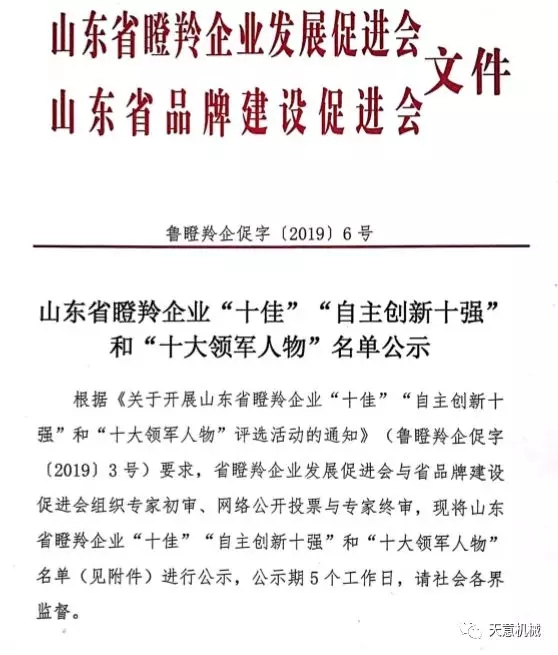 根據(jù)《關(guān)于開展山東省瞪羚企業(yè)“十佳”“自主創(chuàng)新十強(qiáng)”和“十大領(lǐng)軍人物”評選活動的通知》(魯?shù)闪缙蟠僮帧?/span>2019〕3號)要求,2019年12月6日,山東省瞪羚企業(yè)發(fā)展促進(jìn)會、山東省品牌建設(shè)促進(jìn)會發(fā)布魯?shù)闪缙蟠僮?/span>[2019]6號文,公布經(jīng)過專家初審、網(wǎng)絡(luò)公開投票與專家終審,評選出了山東省瞪羚企業(yè)“十佳”、“自主創(chuàng)新十強(qiáng)”和“十大領(lǐng)軍人物”。天意機(jī)械榮獲“山東省十佳瞪羚企業(yè)”稱號。